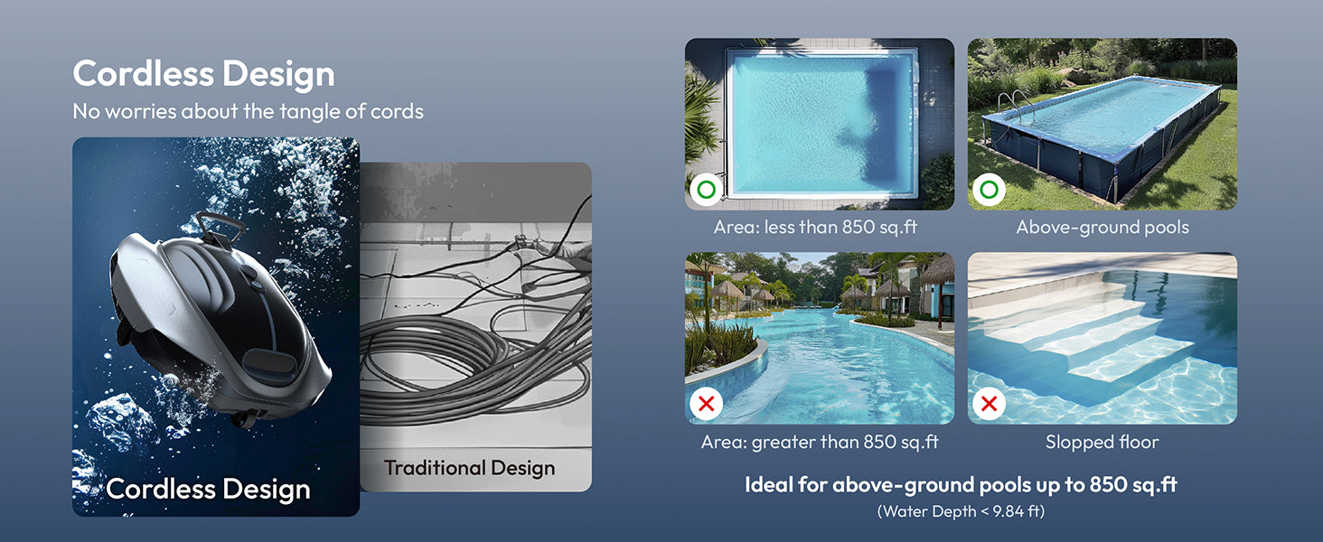 Ideal for above-ground pools with flat floors and no slopes, up to 850 sq. ft. in size.
