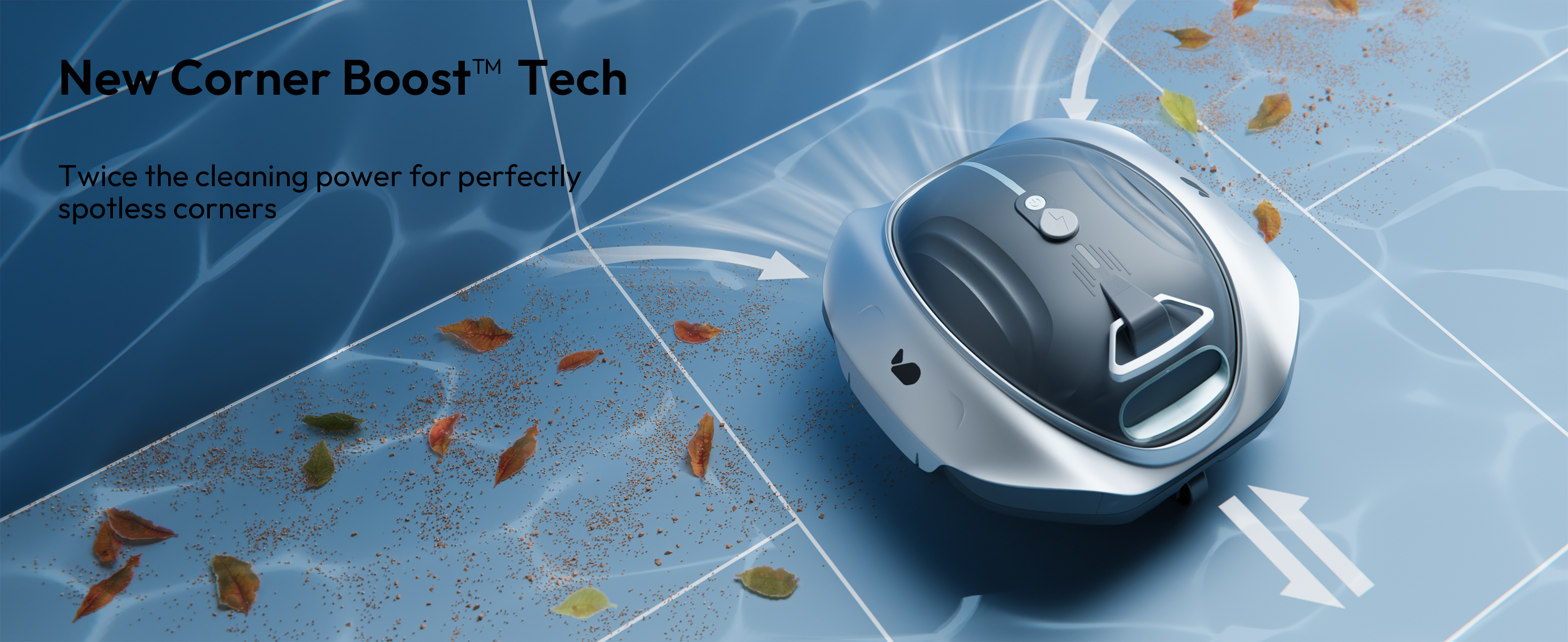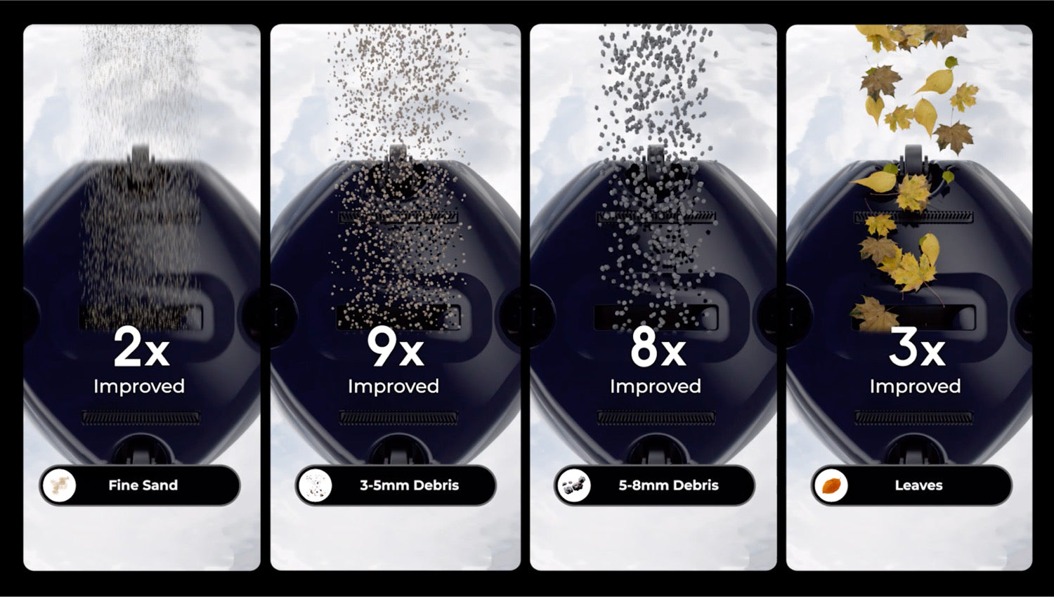 Achieve unmatched suction and efficiency with New Bluehole Technology™ — 2X improved overall performance, 3X improved for leaves, and 8.5X improved for 3mm-8mm debris.